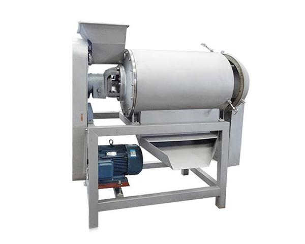 電機(jī)通過(guò)三角帶傳動(dòng),使安裝在花鍵軸上的刮板高速旋轉(zhuǎn),當(dāng)經(jīng)過(guò)破碎的水果通過(guò)進(jìn)料口進(jìn)入機(jī)內(nèi)時(shí),擋漿盤(pán)將物料均勻排發(fā)到刮板和篩網(wǎng)之間,由于刮板的回轉(zhuǎn)作用和導(dǎo)程角的存在,使物料沿著園筒向出口端移動(dòng),移動(dòng)的軌跡呈螺旋狀,物料就在刮板和篩網(wǎng)之間移動(dòng)過(guò)程中受離心力的作用而被擦碎,汁液和肉質(zhì)(已成漿狀)從篩孔通過(guò)進(jìn)入下道工序(雙道打漿機(jī)為聯(lián)動(dòng)重復(fù)上列過(guò)程),皮和籽等則從出渣斗排出,從而達(dá)到自動(dòng)分離的目的。只要變換不同規(guī)格的篩網(wǎng)以及調(diào)整刮板導(dǎo)程角的大小,可改變不同的打漿速度,獲滿意的效果。